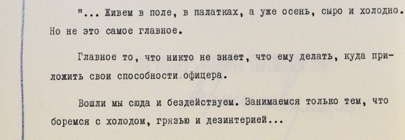 “Живем в поле, в палатках, а уже осень, сыро и холодно”, – жалуется один из офицеров. Но хуже – вынужденное безделье: никто не знает, чем ему заняться, куда приложить свои умения и навыки. По словам офицера, единственное занятие находящихся в ЧССР военных – борьба с холодом, грязью и дизентерией.